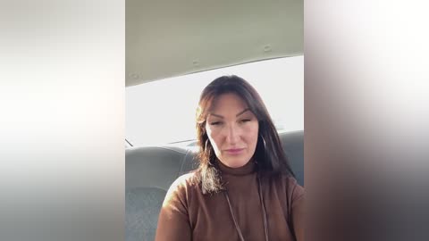 puma69 - A video of an East Asian woman with straight, shoulder-length brown hair, wearing a beige turtleneck, smiling slightly, sitting in a car with a gray headrest. The background is blurred, with a bright light source creating a soft halo effect around her.